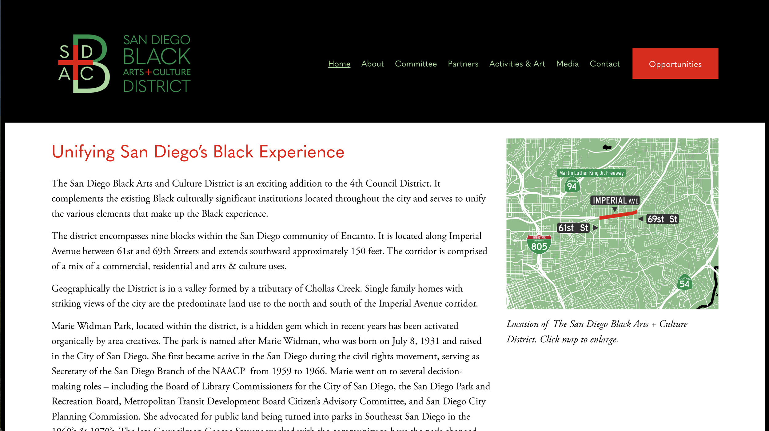 Shea Powell Design has worked with the San Diego Black Arts + Culture District (SDBlackACD) since its founding. The SDBlackACD ‘complements the existing Black culturally significant institutions located throughout the city and serves to unify the various elements that make up the Black experience’.